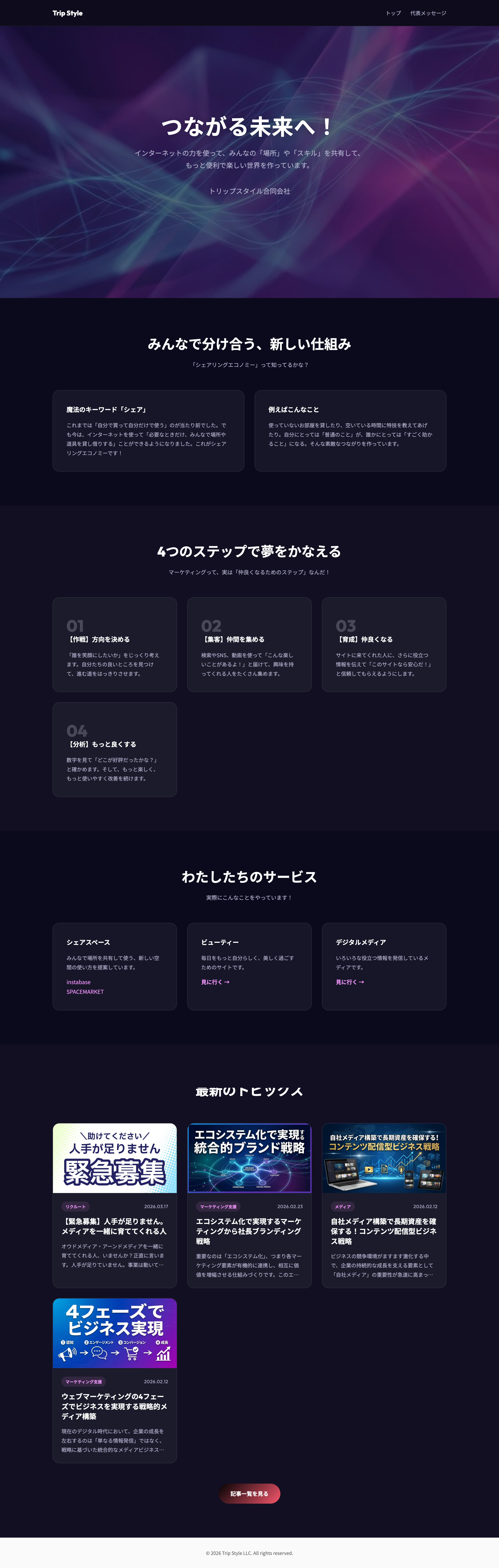 つながる未来へ! インターネットの力を使って、みんなの「場所」や「スキル」を共有して、 もっと便利で楽しい世界を作っています。 トリップスタイル合同会社 様